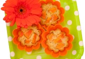 Сладкие мини-кексы из миндальной и кукурузной муки, яичных белков и кокосовой стружки, украшенные кусочками папайи.