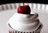 Кексы из темно-шоколадного теста с кофе и ванилином, украшенные зефирной глазурью.