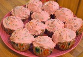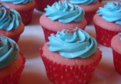 Мини-кексы со свежей клубникой, клубничным и ванильным экстрактом, покрытые сладким сливочным кремом.