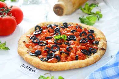 Хрустящая, румяная, сытная лепешка из слоеного теста с помидорами и оливками!