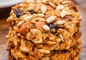 Хлопья овсяные 2 стаканаЙогурт натуральный обезжиренный 100 гМука пшеничная ½ стаканаМед 4 столовые ложкиЯйцо куриное 2 штукиВишня сушеная 150 гМиндаль 50 гЦедра апельсина 50 гКорица молотая ⅓ чайной ложки
