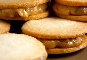Сладкое испанское и латиноамериканское угощение - печенье-сэндвичи из песочного теста с начинкой из вареной сгущенки (дульче де лече) с пеканом.