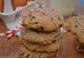 Вкусное и сладкое печенье с шоколадными чипсами, карамелью и миндалем.