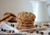 Печенье из овсяных хлопьев с миндальной мукой и молоком и кусочками горького, темного и молочного шоколада.