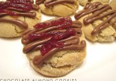 Миндальное печенье, украшенное растопленным шоколадом. Можно сверху добавить немного джема.