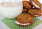 Печенье с тертой морковью и изюмом, овсяными хлопьями, корицей, мускатным орехом и имбирем, склеенное в сэндвичи с помощью сливочно-ванильного крема.