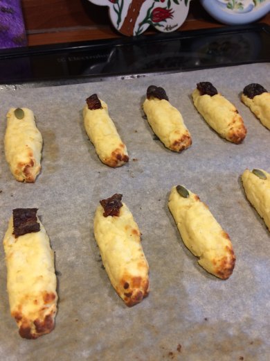 Attention: Адыгейский сыр можно заменить любым другим сыром на ваш выбор! Сыр натереть, добавить остальные ингредиенты, кроме томатов и семечек/орехов(они для украшения), хорошо промесить. Сформировать шар, убрать в холод на 30мин. Сформировать пальчики, украсить «ногтями». Выпекать 10-12 мин при 200С. Ps томаты я использовала не в масле
