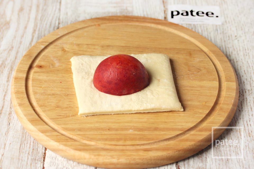 Теперь формируем слойки. В центр каждого кусочка теста выкладываем половинку персика разрезом вниз.