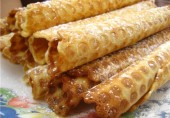 Готовые вафли следует сворачивать трубочкой, пока они горячие. Остывшие вафли будут не сворачиваться, а ломаться.