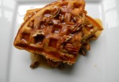 Приготовьте вафли с сладким картофельным пюре, корицей, гвоздикой и мускатным орехом и подавайте с кленовым сиропом и рублеными орехами.