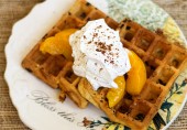 Вафли на пахте с мелко нарезанными консервированными персиками и корицей.