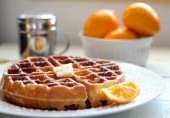 Золотистые вафли на пахте с соком и цедрой лимона. Подавайте с маслом и сиропом, посыпав сахарной пудрой и украсив дольками лимона.