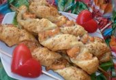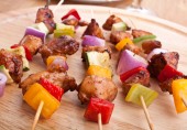 Шашлык из куриного филе, маринованного в йогурте с чесноком и специями, и приготовленного на гриле с луком и сладким перцем.
