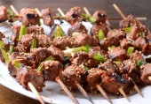 Баклажаны с говяжьим фаршем на бамбуковых шпажках