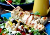 Греческий шашлык из куриного филе с салатом из латука, помидоров, огурцов, сыра и оливок и соусом дзадзики.
