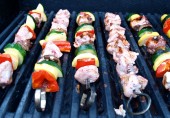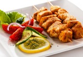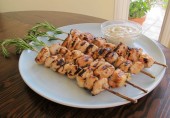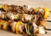 Куриное филе, маринованное в лимонном соке с цедрой, дижонской горчицей, чесноком и розмарином и обжаренное на шпажках из веточек розмарина.