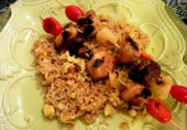 Шарики из фарша индейки с сухарями, имбирем, соевым соусом и специи, нанизанные на шпажки и обжаренные на гриле.