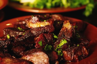 Говяжий стейк, маринованный в бульоне с чесноком и специями и приготовленный на гриле с овощами.