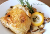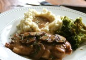 Жареная куриная грудка с соусом из грибов с луком, чесноком и тимьяном, тушеных в белом вине и курином бульоне.