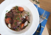 Французское блюдо - курица, обжаренная на масле и сваренная в соусе из красного вина с морковью, шалотом, сельдереем, беконом и грибами.