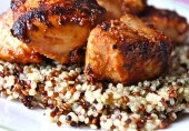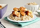 Куриное филе, маринованное в смеси из соуса для шашлыка с ананасовым йогуртом и обжаренное в сковороде.
