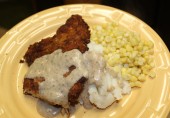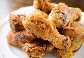 Куриные грудки, маринованные в пахте с яйцом, кайенским перцем и чесночным порошком, покрытые мукой со специями, обжаренные в масле на плите и доведенные до готовности в духовке.