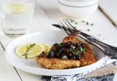 Жареное куриное филе с румяной корочкой из сухарей с миндальной мукой и тимьяном и консервированная фасоль с черными оливками, тимьяном и лимоном.