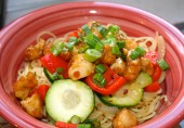 Курица, обжаренная в растительном масле с красным перцем, кабачком, луком, чесноком и специями. Подавайте со спагетти или рисом.