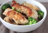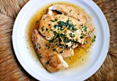 Куриное филе, обжаренное в масле и тушенное в бульоне с петрушкой, тимьяном, чесноком и цедрой лимона.