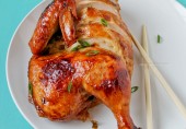 Курица, маринованная в соевом соусе с анисом, чесноком, имбирем, цедрой апельсина и соусом хойсин и приготовленная в духовке.