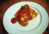 Куриное филе, маринованное в бальзамическом уксусе с чесноком, горчицей, медом и лимонным соком и обжаренное на гриле, с сыром горгондзола и вялеными помидорами.