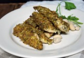 Куриные грудки, смоченные во взбитом яйце и покрытые смесью измельченных фисташек с сухарями, черным перцем и коричневым сахаром.