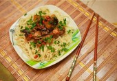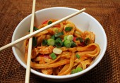 Куриное филе, обжаренное с морковью, перцем и баклажанами, в соевом соусе. Подавать с пастой или другим гарниром, на ваш вкус.