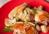 Запеченная курица с лимонами и белым вином идеально сочетается с рисом и другими гарнирами.