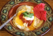Сытное простое блюдо из итальянских лепешек тортилья, вареной курицы, вкусного соуса на основе крем-супа и томата.
