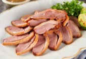 Вместо привычной мясной нарезки попробуйте подать к столу в качестве закуски филе утки горячего копчения с брусничным или клюквенным соусом.