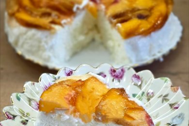 Нежный лёгкий торт с персикамиЕсли используете консервированные- сироп надо слить, откинуть фрукты на сито и даже можно промокнуть салфеткой.