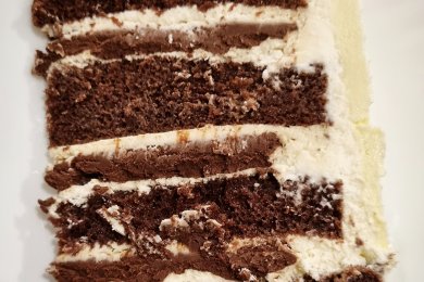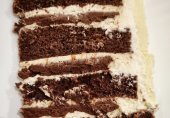 Вкусный мега-шоколадно-кремовый торт. Шоколадные коржи, творожно-сливочный крем, шоколадно-кофейный сливочный слой, кофейная пропитка и покрытие из белого шоколада и сливок.