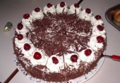 Бисквитный торт, пропитанный вишневой наливкой, с вишней, замоченной в наливке, сливочным кремом и шоколадной стружкой.