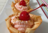 Чашечки из слоеного теста фило с начинкой из сливочного сыра с риккотой и вишневым соком, посыпанные фисташками и украшенные вишней.
