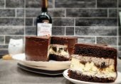 Нежный шоколадный бисквит, пропитка из сгущенки, яблочный слой и творожно-сливочный крем.
