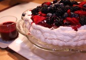Аппетитный торт-безе, украшенный ягодами и фруктовым соусом.
