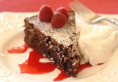 Шоколадно-миндальный торт без муки, простой в приготовлении и очень вкусный, с малиновым соусом и взбитыми сливками.