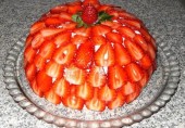 Бисквитный торт, пропитанный клубничным сиропом, с безе, взбитыми сливками и свежей клубникой.