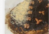 Бисквитный торт с медово-коньячной пропиткой, кремом из сметаны с желатином и грецкими орехами.
