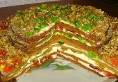 Медовый торт из песочного теста, состоящий из 8-10 коржей, промазанный кремом со сгущенкой и посыпанный песочно-ореховой крошкой.