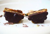 Кексы из фиников, орехов и овсяных хлопьев, с начинкой из арахисового масла, покрытые шоколадом.