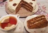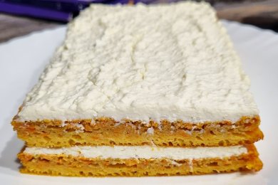 Морковный торт состоит из пряных коржей с добавлением корицы, муската и орешков. Они настолько самодостаточны, что крема для прослойки можно брать по минимуму.