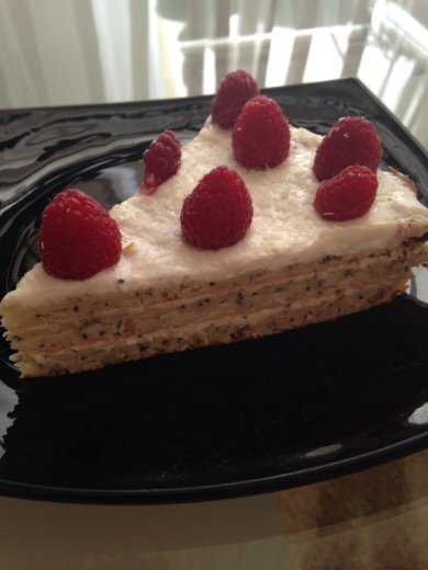 У меня творожная масса Президент 0,2% жирности. Она как густая сметана. Смешать все и промазать коржи. Украсить по желанию. Я выложила малину и присыпала кокосовой стружкой. Приятного аппетита!
