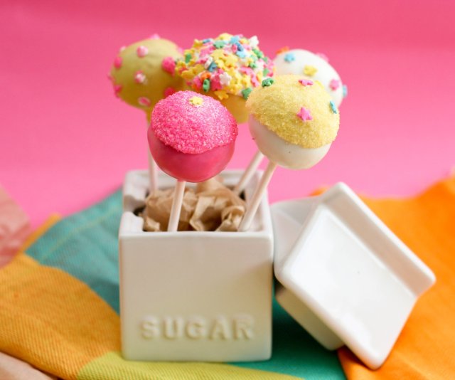 Таким же образом расправьтесь с остальными чупа-чупсами. Прежде чем их украшать, дайте им застыть. Чтобы украсить, как я, нанесите немного глазури, чтобы закрепить посыпку в виде цветочков. Для этого обмакните верхнюю часть шарика в глазурь и сразу же обмакните шарик в посыпку или сахар.